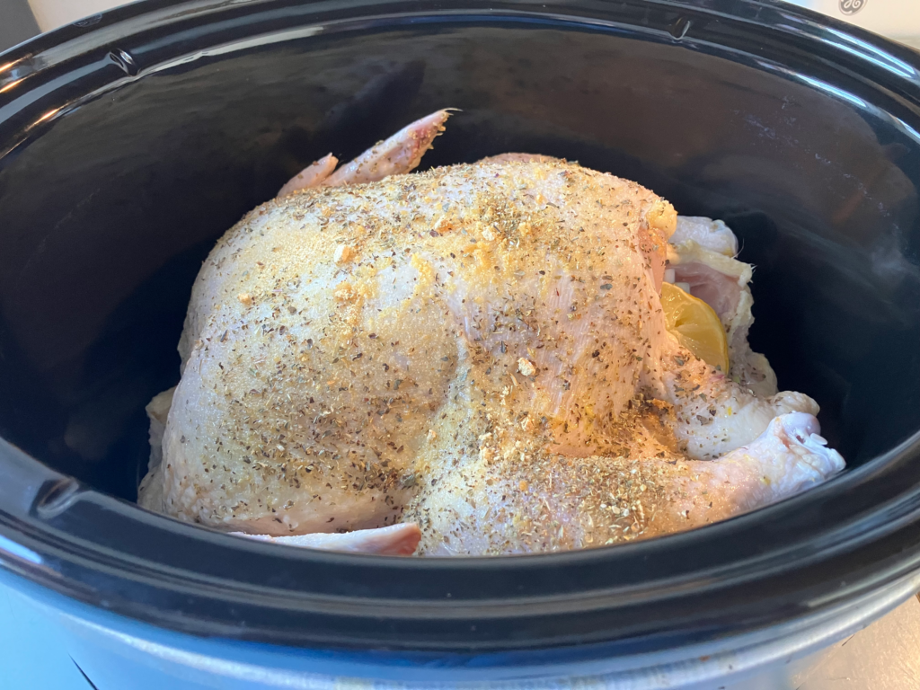 This is probably my favorite way to cook a chicken because–let’s face it–croc pot meals are a life saver as a mom.