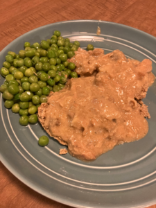 Scrape your leftover meat and drippings into a large sauce pan, and slowly heat it till all the juices are liquified. Add your milk to the sauce pan and stir in your flour at the same time. Bring the sauce pan to a simmer and let it simmer for 5-10 minutes while stirring to ensure it does not burn on the bottom. When you start to see that the gravy is thickening, you can remove from the heat and let it cool. It will continue to thicken as it cools. The ratios do not have to be precise, but you have to ensure that you’ve used enough flour, or it will not thicken well. I like to use a ratio of about 1:1 of milk to drippings, and I use about 1 tablespoon of flour for every cup of liquid.