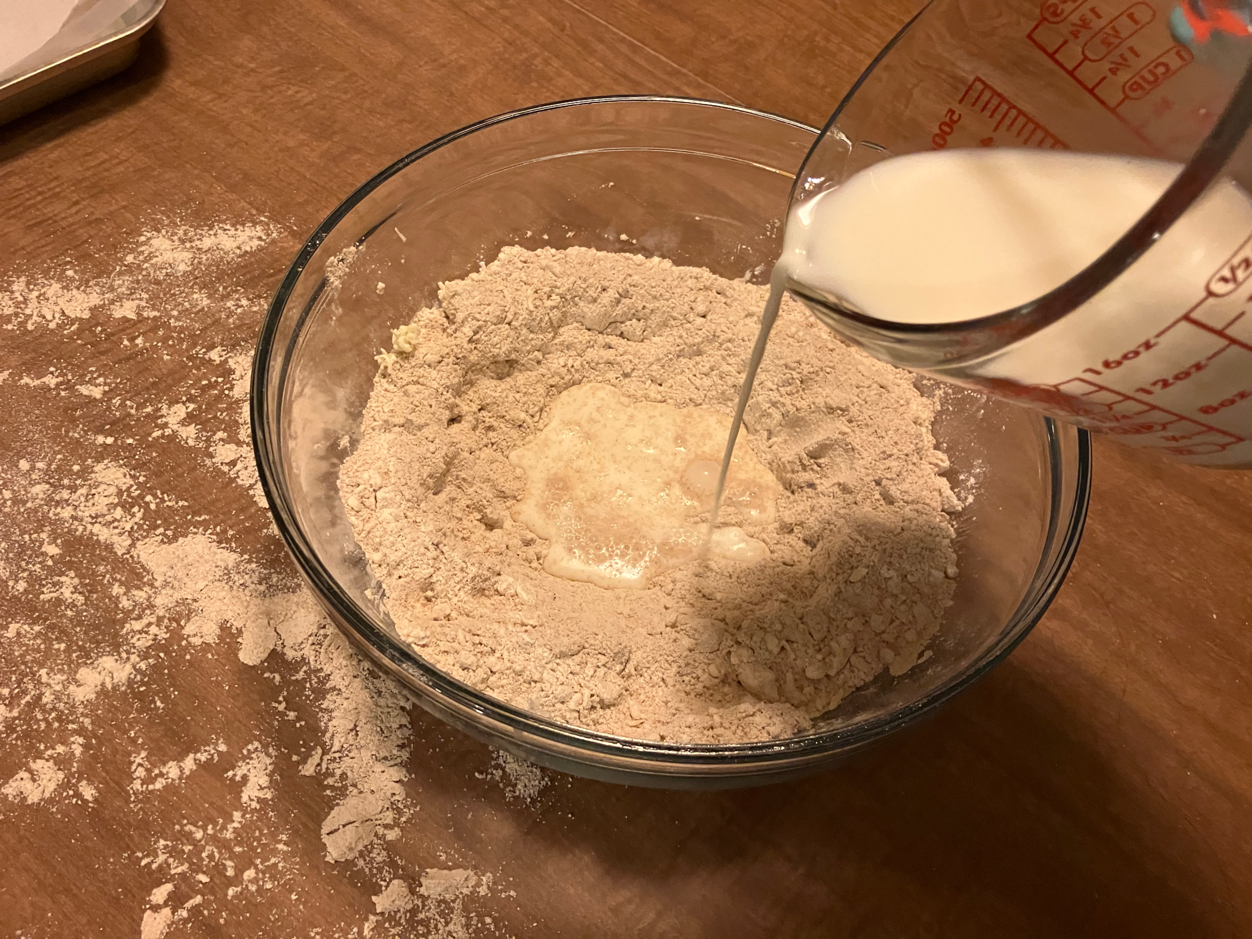 Mix the flour, baking powder, and salt in a bowl. Cut the cold butter into the flour mixture. (I like to use a cheese grater.) You can even grate the butter beforehand, and allow it to chill again in the fridge to ensure it is extra cold. Although, I have had good success just grating it straight into the bowl. Add your milk to the flour and butter mixture and mix by hand until it becomes a shaggy dough.